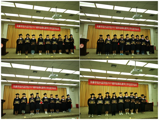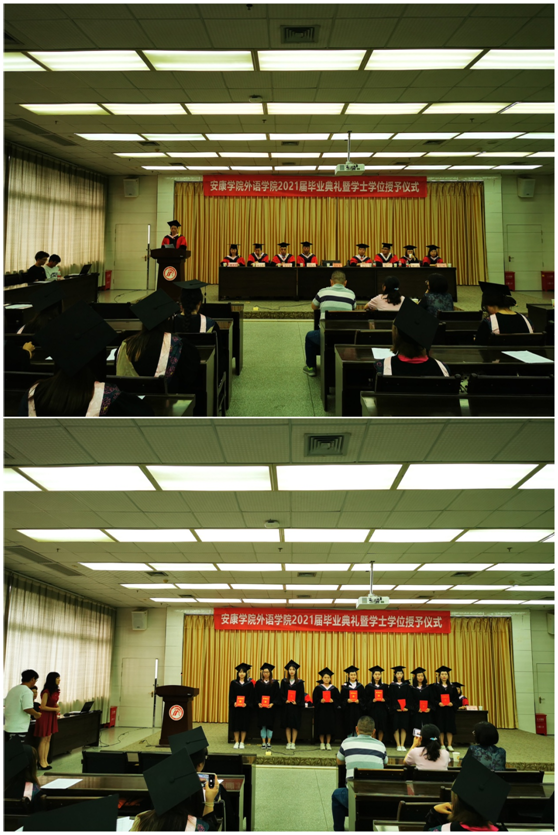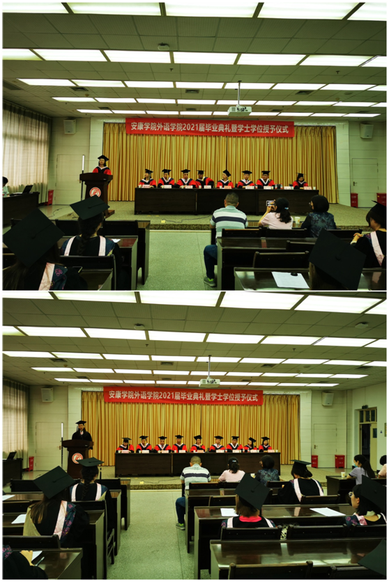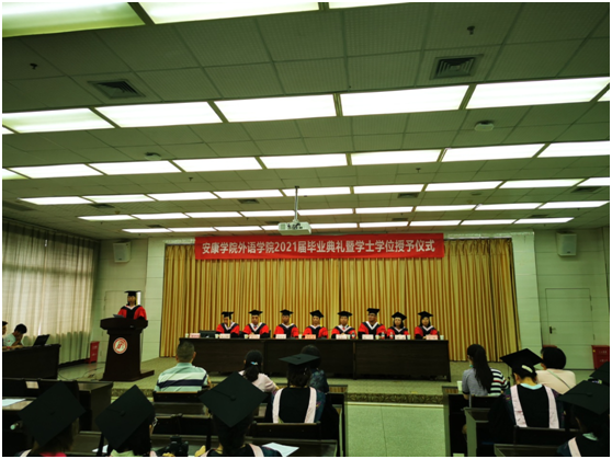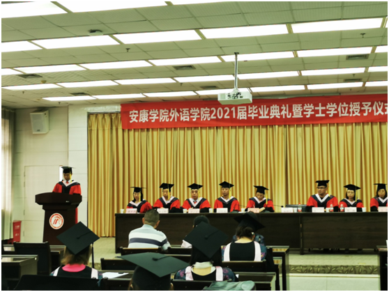 7月5日下午3点,安康学院外语学院2021届毕业生毕业典礼暨学士学位授予仪式在图书馆报告厅隆重举行。外语学院党政领导班子成员、教师代表、两办工作人员及2021届毕业生共同出席了典礼,活动由外语学院副院长胡卫卫主持。