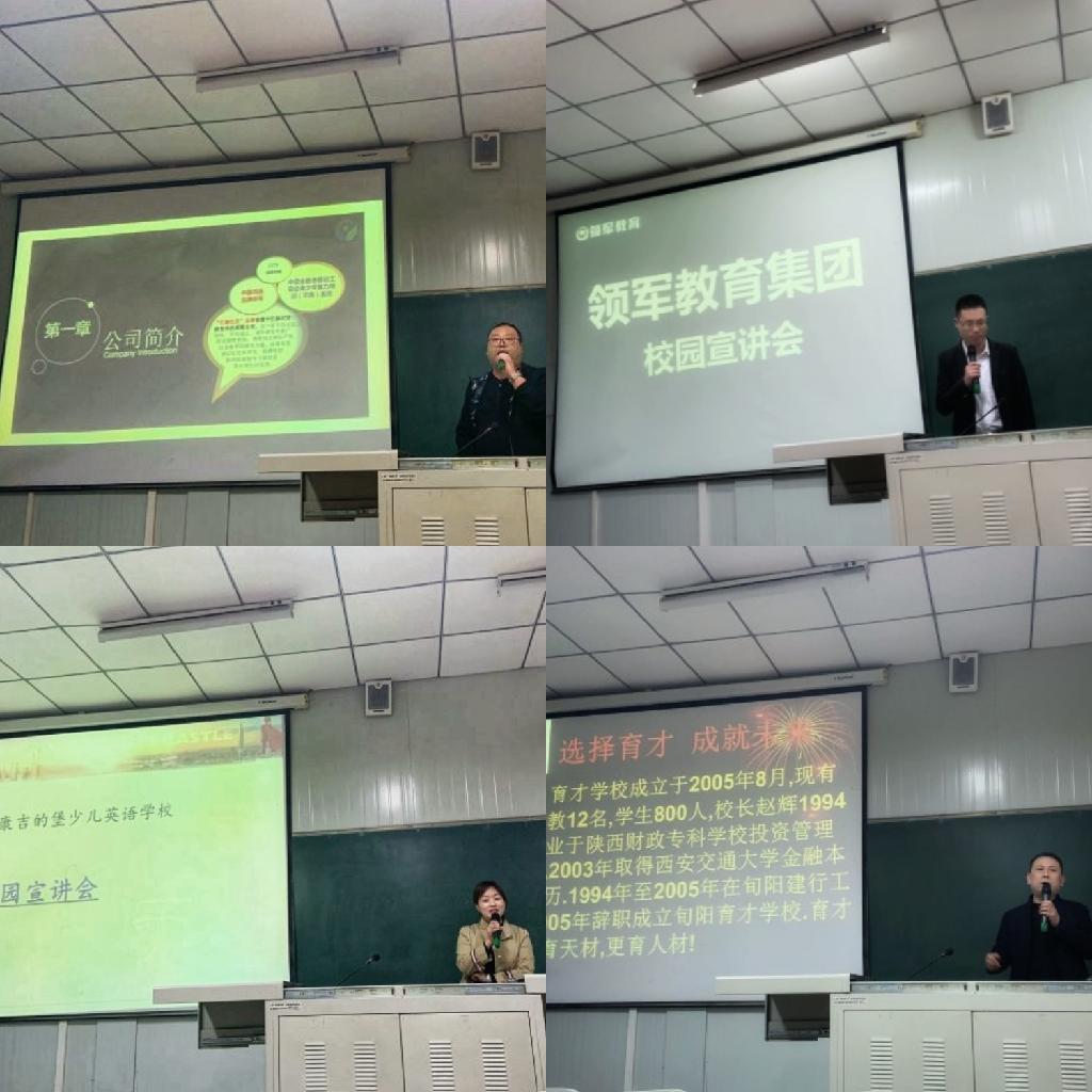 四场招聘会的用人单位分别是领军教育、安康吉的堡英语学校、忆触记发以及旬阳育才学校。每场招聘会上,招聘单位通过播放宣传片、PPT展示、面对面交流等方式向同学们介绍公司的概况、职业晋升通道以及薪金福利等,并在择业方面给与学生许多建议。
