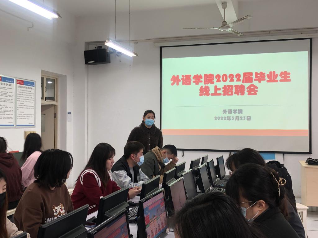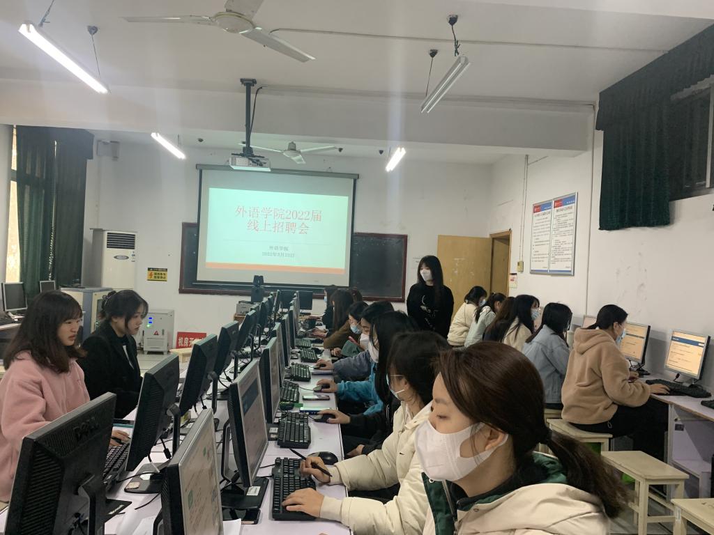 外语学院按照学校就业工作部署,于2022年3月23日上午在图书馆四楼北机房和6206机房,组织22届全体毕业生集体参加本次线上招聘。外语学院党总支书记肖红香,毕业班辅导员常远红、李梦全程指导。此次招聘会采用网络双选会场+视频面试的形式,用人单位线上发布招聘信息,查看毕业生简历,通过网络视频对应聘毕业生进行面试;毕业生在线投递简历、申请面试,视频面试及线上即时交流,互动效果良好。