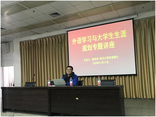 11月11日,外语学院专任教师、武汉大学在读博士鲁克伟在图书馆六楼报告厅为学生开展了《外语学习与大学生生涯规划》专题讲座。副院长张哲华、胡卫卫、部分教师和全体学生聆听了讲座并进行了互动交流。