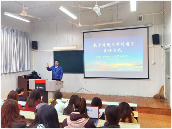 为提高我院商务英语专业学生专业认知,11月24日,中国国际贸易学会全国贸易业务员岗位培训中心副主任、高级经济师王斌应我院邀请,为商务英语专业学生开展了《基于跨境电商的商务英语实战》专题讲座。我院副院长张哲华、胡卫卫、部分商务英语专业教师和商务英语专业三个年级学生聆听了讲座并进行了互动交流。