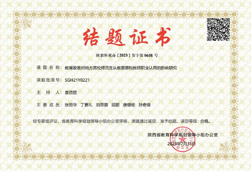 袁昌丽老师主持的课题《教育政策对地方高校师范生从教意愿和教师职业认同的影响研究》(SGH21Y0221),通过研究团队的系统认真研究,先后完成调研报告1篇,公开发表研究论文2篇,通过调研、访谈、问卷调查、数据收集与分多环节,让课题组成员进一步了解了当前教育政策(“双减”政策)背景下地方高校师范生职业认同现状。该课题的研究结果对提高地方高校师范生从教意愿和教师职业认同等方面提供了有效的建议,尤其是在加强对师范生的思想政治教育、优化师范生培养方案等方面的思考,积极促进更多教育界学者、教育主管部门更加关注教育政策变化对地方高校普通师范生以及在职教师的影响,以便为我国基础教育发展提出更为有效的政策。