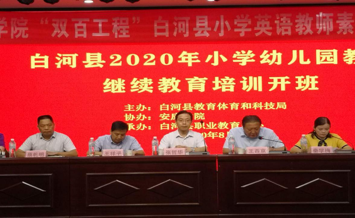 8月1日上午,安康学院 “双百工程”暨白河县小学幼儿园教师继续教育培训开班仪式在白河县职教中心举行。活动由白河县教体与科技局副局长秦学梅主持,白河县教体与科技局局长王西京、白河县职教中心校长蔡乾明、白河县职教中心副校长胡晓伟、安康学院外语学院副院长张哲华等出席开班仪式。白河县小学、幼儿园的英语及体音美教师参加了开班仪式。