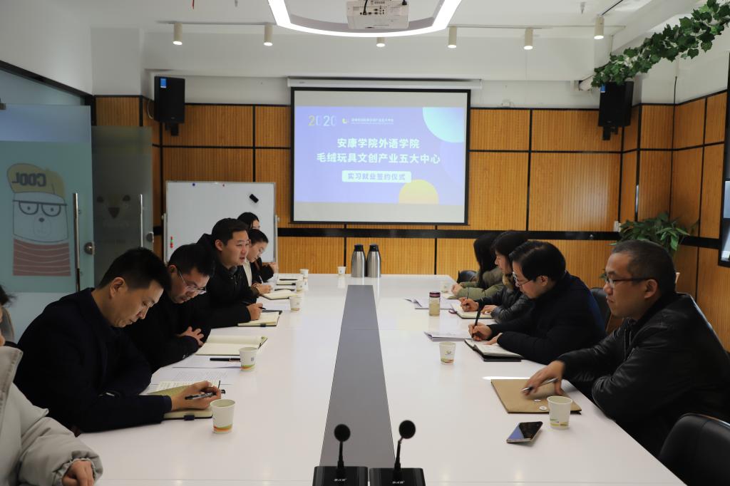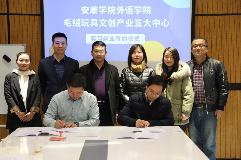 为加快商务英语专业建设,促进校企合作深度融合,助推安康社会经济发展,1月14日,外语学院与安康市毛绒玩具文创产业五大中心签订战略合作协议并举行授牌仪式。恒口示范区毛绒玩具领导小组办公室主任李伟、五大中心运营商(安康秦巴漫创玩具产业运营管理有限公司)负责人刘愚、外语学院副院长(主持工作)张哲华、副院长胡卫卫、商务英语系主任彭方圆、骨干教师贠旭及外语学院部分实习生参加了签约与授牌仪式。活动由五大中心负责人刘愚主持。