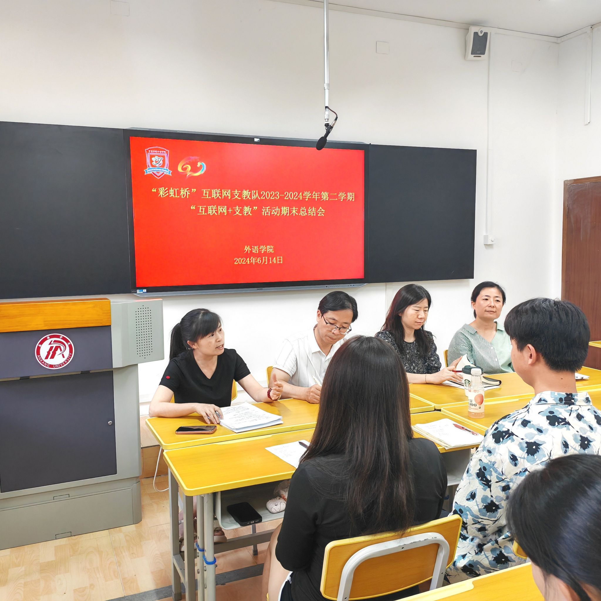 6月14日下午,外语学院“彩虹桥”互联网支教队于6107教室顺利召开了本学期“互联网+支教”活动期末总结会。外语学院领导班子、英语系主任、支教队指导教师以及全体支教队成员参加了此次会议。会议由支教队队长左依婷主持。