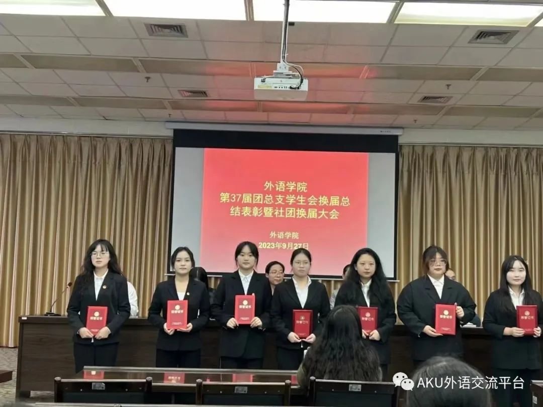 会议第三项,党总支书记肖红香宣布第37届团总支学生会各部门负责人名单并为优秀主席、干事、外院各专业社团优秀社长颁发荣誉证书。最后,张哲华院长做了大会总结,对往届团总支学生会成员的工作表示肯定,并对新一届成员提出了殷切期望。