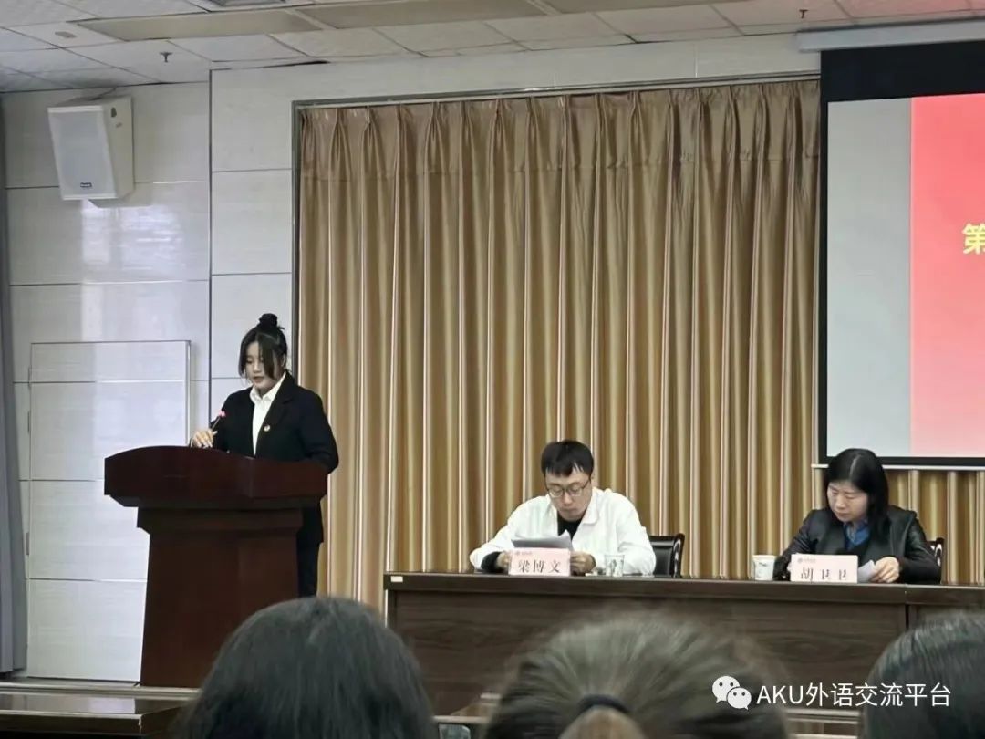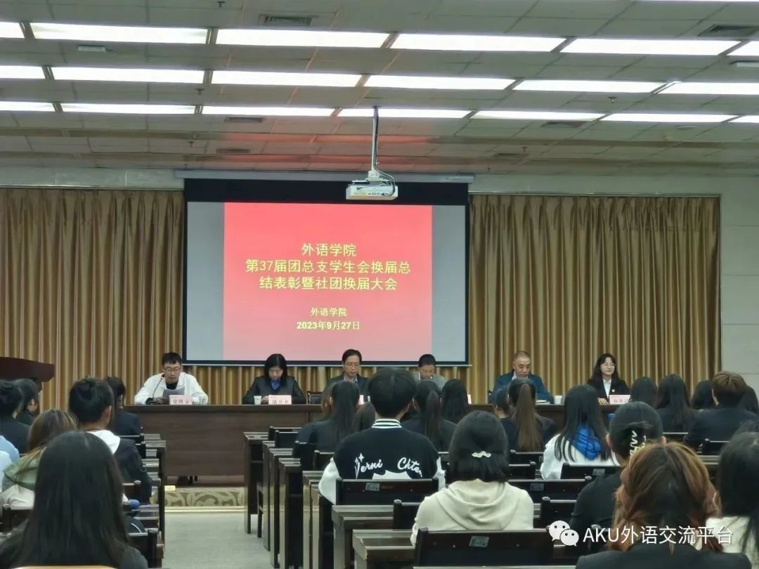 外语学院第37届团总支学生会换届总结表彰暨社团换届大会于2023年9月27日在图书馆6楼报告厅顺利举行。外语学院党总支书记肖红香,院长张哲华,副院长胡卫卫、刘子富,专业社团负责老师袁昌丽、朱国琴、冯琳、张雪冰出席了本次会议,会议由外语学院团总支书记梁博文老师主持。