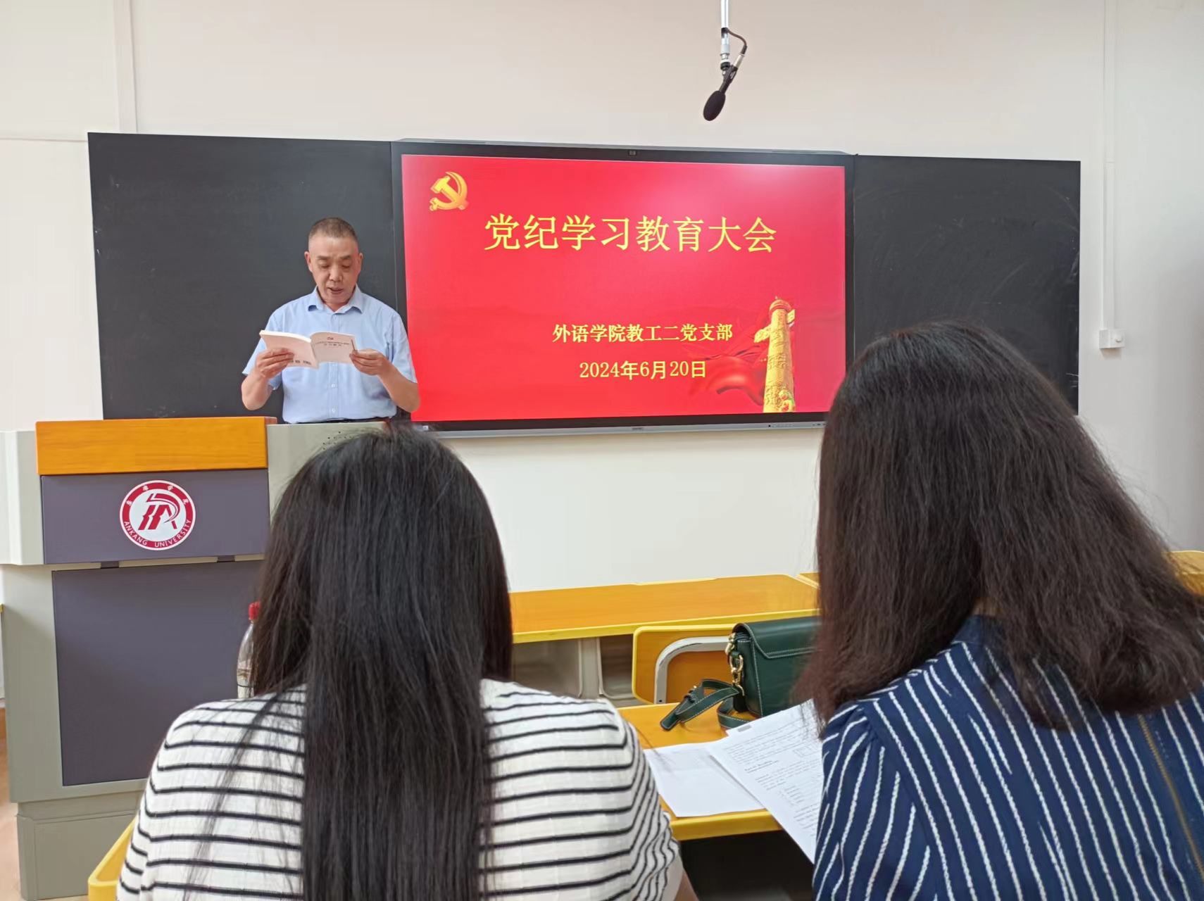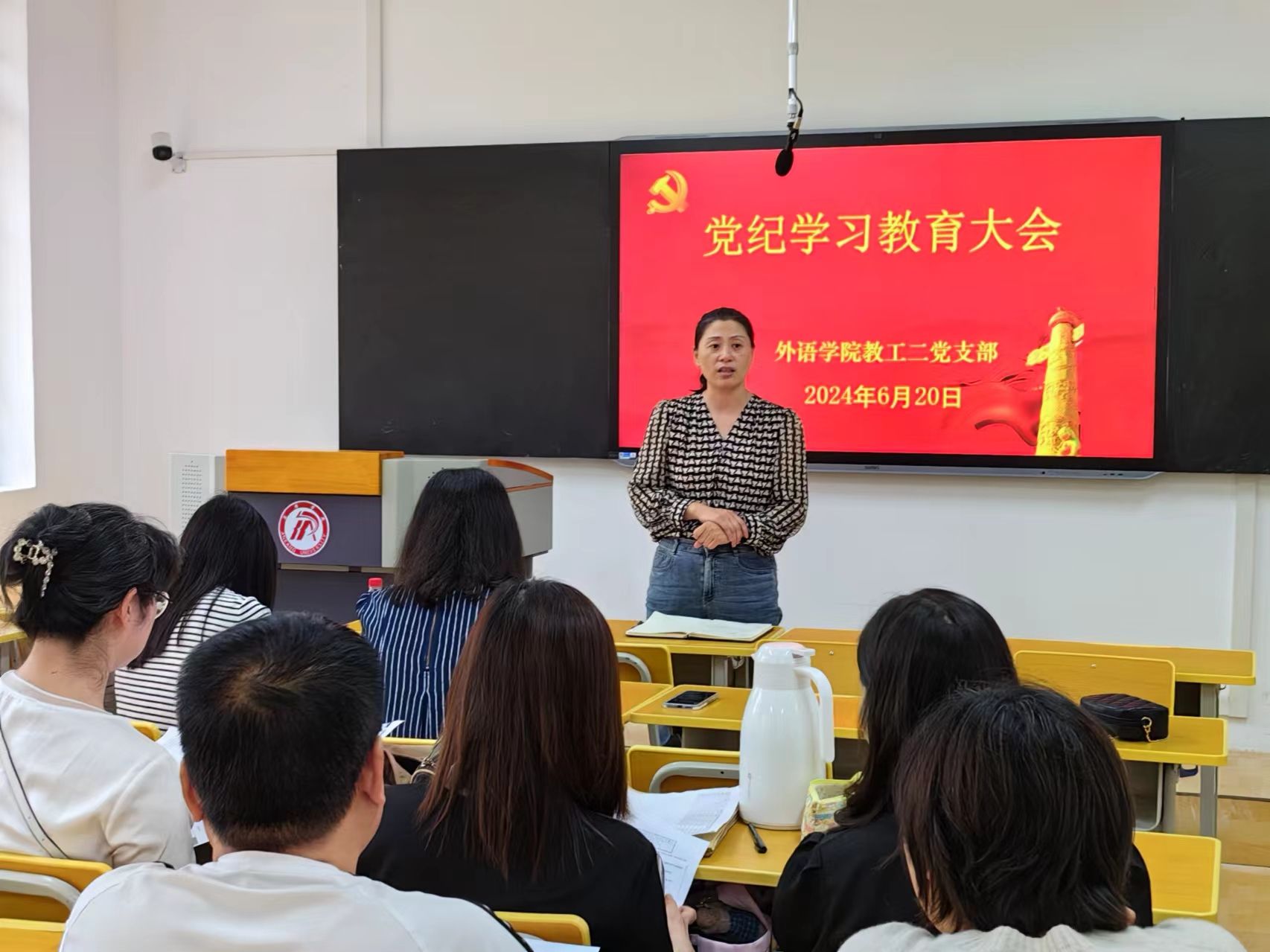 为深入开展党纪学习教育工作,外语学院教工二党支部于2024年6月20日在6107室召开党纪学习教育大会,全体支部党员参加会议,外语学院党总支书记肖红香以普通党员身份参加了会议。本次会议由党支部书记刘子富主持。