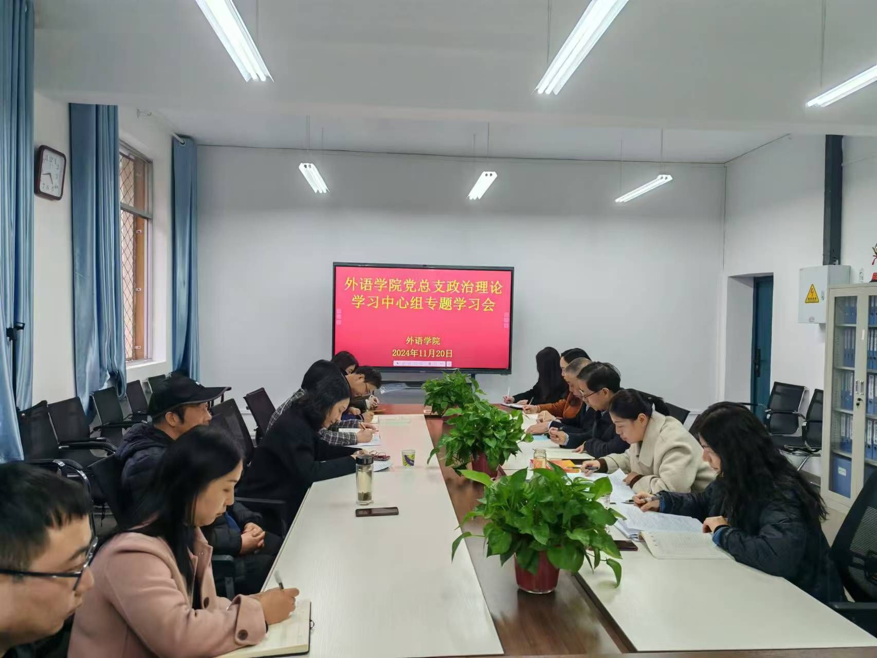 11月20日下午,外语学院党总支在外语学院二楼会议室召开政治理论学习中心组专题学习会。副校长崔晓明旁听指导学习会议,学院理论学习中心组全体成员参加了学习交流,会议由党总支书记肖红香主持。