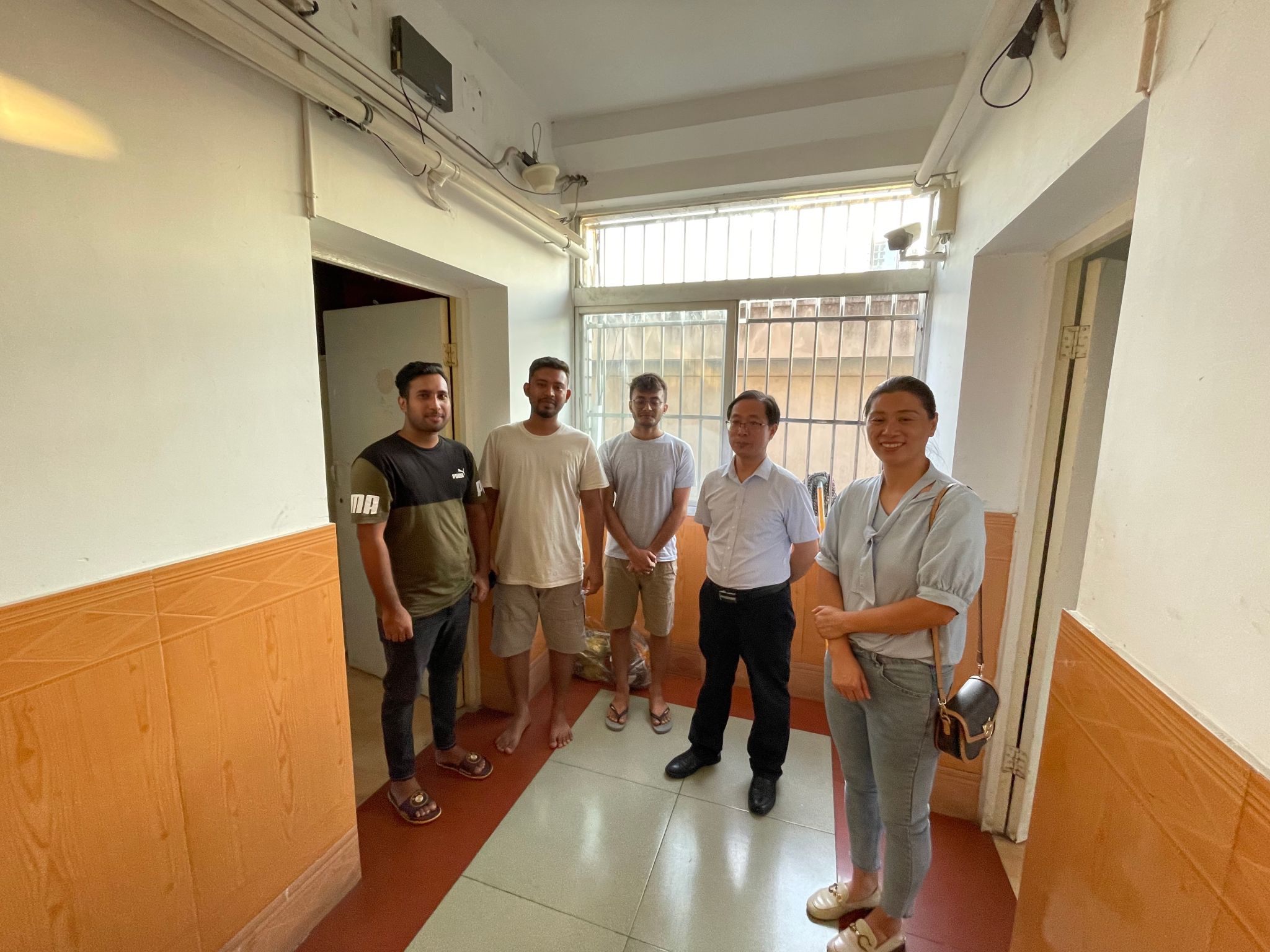 2023年9月13日下午,国际教育学院院长张哲华、副院长肖红香、学工办副主任黄梓轩、留学生辅导员陆传梓一行,深入留学生公寓,展开了一次温暖而关切的走访活动。看望和慰问返校的留学生,同时检查公寓厨房、水房等公共设施,关心他们的生活起居,并鼓励他们努力学习,积极实践,为实现自己的人生理想不懈努力。