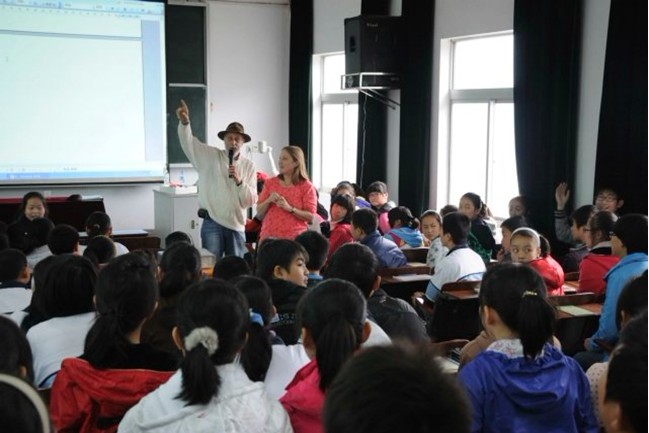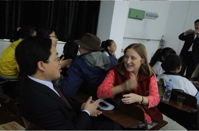上午9时,该校向长峰校长对我院外教及陈刚副院长等一行的来访举行了隆重而热烈的欢迎仪式。欢迎仪式上,我院陈刚副院长和旬阳县教体局熊本奇局长分别作了重要讲话。随后,两位外教同城关一中校领导一起观摩了该校刘娜老师一节口语教学课,并同该校英语教师交流及探讨了相关教学问题。接下来,Alan和Dana夫妇合作授课,向该校师生介绍了美国的历史、文化、地理及风土人情等。授课结束后,该校TIC(Total Immersion Class)学员向外教进行了互动提问。两位外教课堂教学气氛活跃轻松,语言简洁明了,风趣幽默,不时赢得该校师生的热烈掌声。