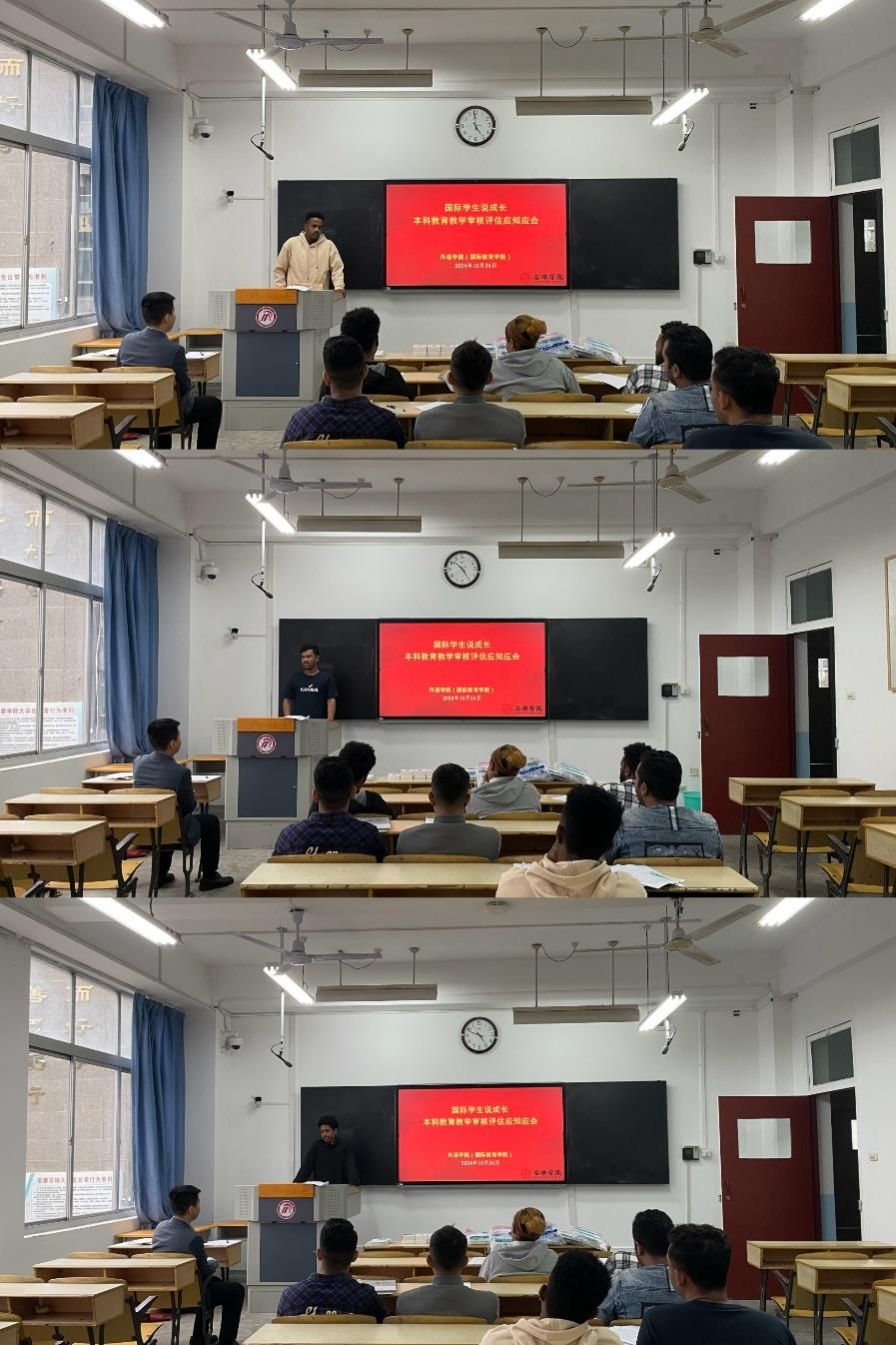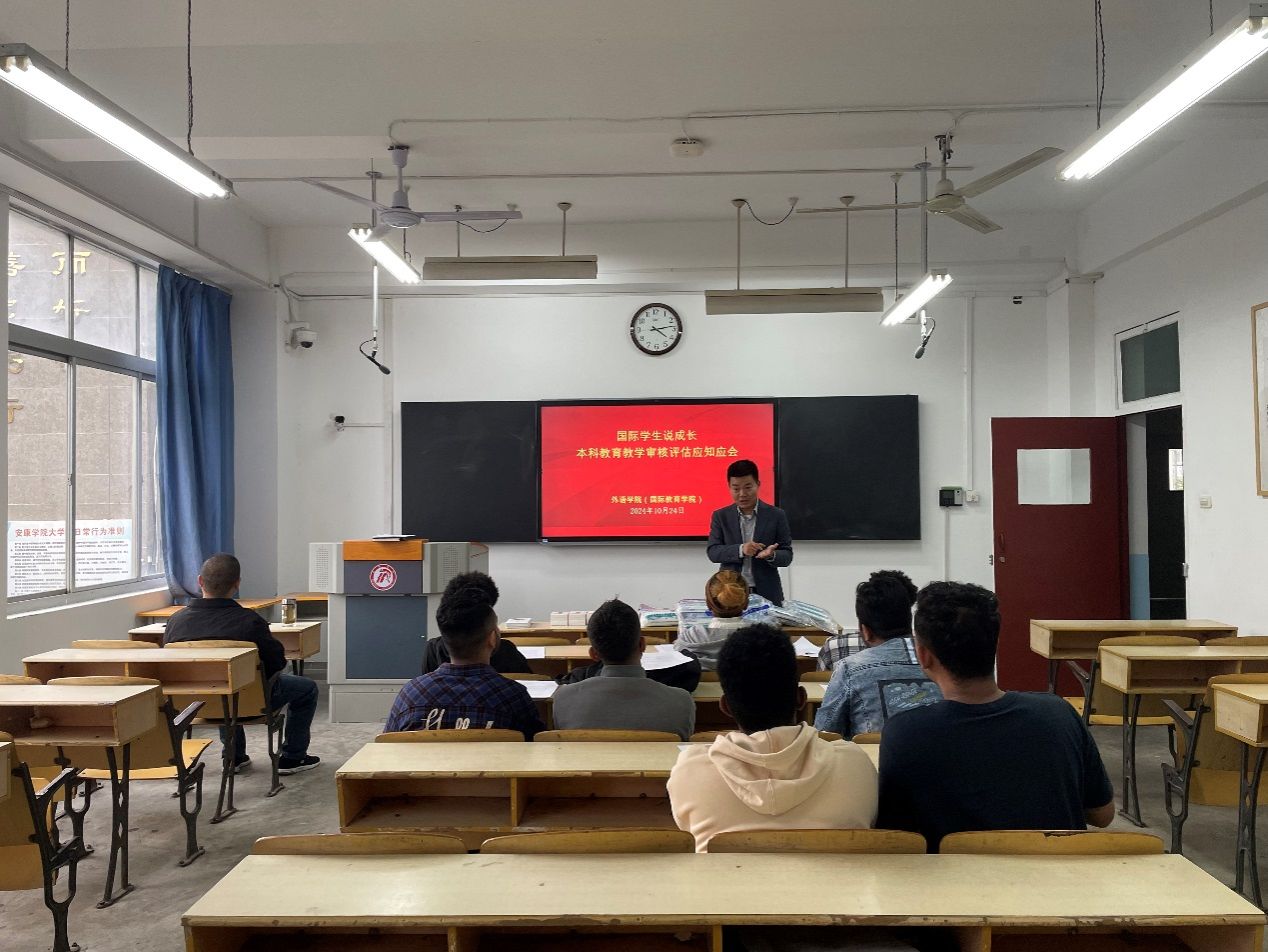 为加强来华留学生对我校本科教育教学审核评估工作的认识,促进国际学生全面发展,10月24日下午4:00,国际教育学院在1209教室召开了“国际学生说成长”暨本科教育教学审核评估应知应会主题班会。会议由留学生教育办公室主任黄梓轩主持,外语学院教师孙卫斌、留学生专职辅导员陆传梓及全体留学生参加了此次会议。