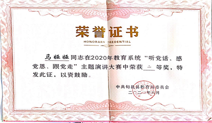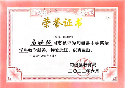 为加快推进我省新时代基础教育“三级三类”骨干教师建设,落实立德树人根本任务,2022年5月在旬邑县教育局开展的教学能手选拔活动中,我校外语学院2018届优秀毕业生马娅娅凭借扎实的教学基本功获得“旬邑县教学能手”荣誉称号,这是她第二次获得“教学能手”称号。