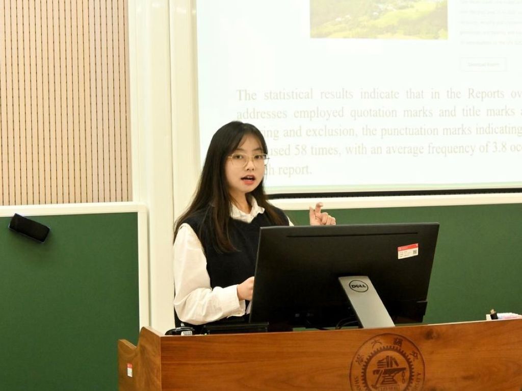 周玉毓,女,山东青岛人,2000年出生。2022年7月毕业于安康学院外语学院商务英语专业,本科期间取得高中英语教师资格证、专八证书、商务英语高级翻译证书等。曾获优秀毕业生、校三好学生、国家励志奖学金等荣誉。现于四川外国语大学读研,就读专业为外国语言学及应用语言学(商务英语研究)。研究生在校期间,担任第36届校研究生会学生干部,获得研究生二等奖学金、学生志愿服务活动先进个人等称号;积极参与各种学术会议,于2023年11月向安徽师范大学组织的“一带一路”建设与中外语言文学文化交流互鉴专题研讨会投稿摘要,在会上宣读论文交流,宣读论文题目为“大学生跨文化商务能力培养——中国商务谈判课程研究”;于12月参与上海交通大学举办的“第四届话语研究前言会议”,在小组专题研讨宣读论文“和谐话语视角下的企业可持续发展报告互文性分析”。